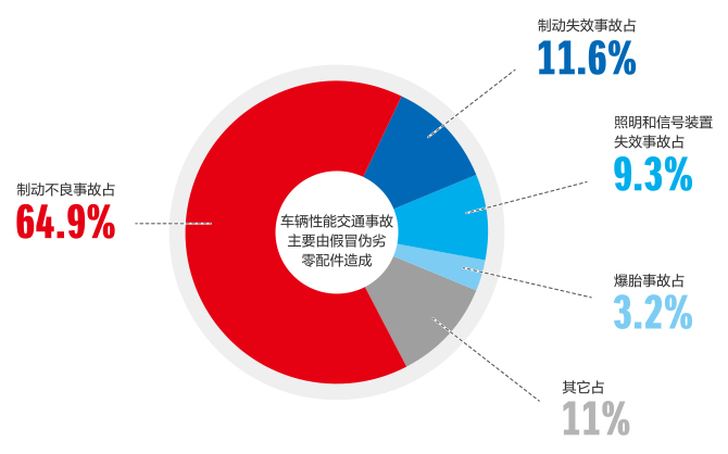 據(jù)交警部門(mén)統(tǒng)計(jì),車(chē)輛性能交通事故主要由于使用假冒偽劣零配件造成,其中制動(dòng)不良事故占64.9%、制動(dòng)失效事故占11.6%、照明和信號(hào)裝置失效事故占9.3%、爆胎事故占3.2%。(資料來(lái)源:新華網(wǎng))